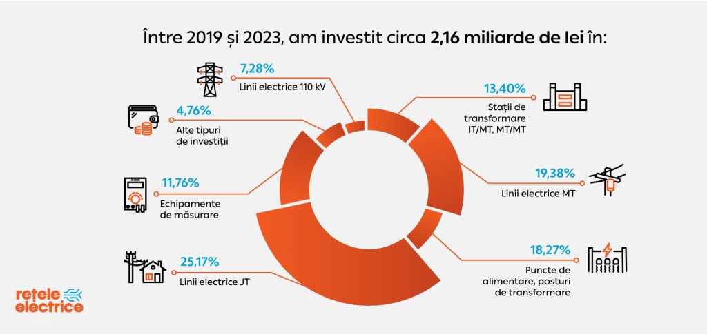 În 2024, avem în plan montarea a peste 81.000 de contoare inteligente în București și în județele Ilfov și Giurgiu plus investiții de 338 de milioane de lei în modernizarea, extinderea și digitalizarea rețelelor – 111 milioane de lei pentru modernizarea liniilor și stațiilor de transformare de înaltă tensiune, 46 de milioane de lei pentru lucrări de modernizare și construcție de linii de medie tensiune și posturi de transformare, 112 milioane de lei pentru lucrări de joasă tensiune.